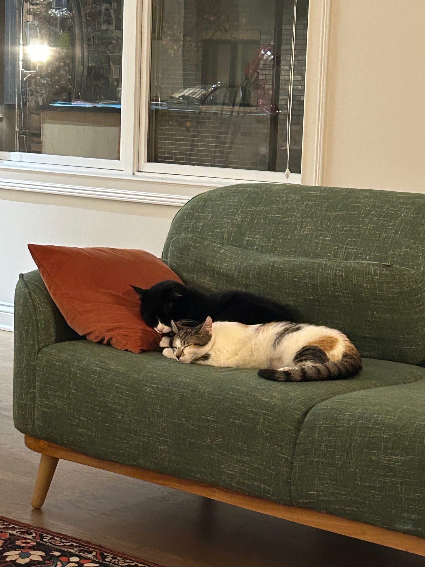 Possibly the only animal more heartbroken than we by the loss of our cat Steven (on New Year’s Day 2024, no less) was Māomī, our resident feline. So, we’re pleased, though not at all surprised, it only took him a week to take the new arrival under his wing. Or furry armpit, I guess.